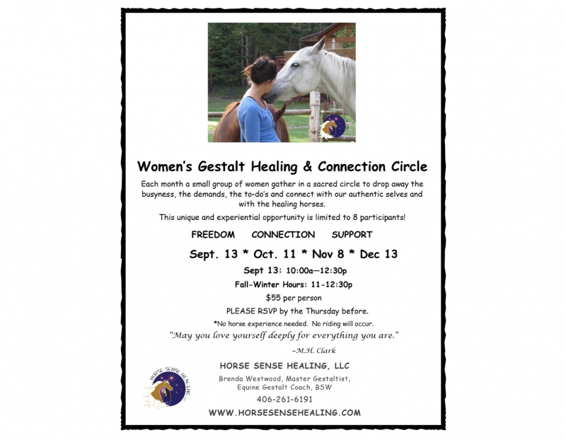Join this unique healing circle and express your authentic self, experience personal growth in a safe and supportive environment and connect with the deep wisdom of the horse. Experience the powerful Equine Gestalt Coaching Method®. Freedom. Connection. Support. **No horse experience required. No riding will occur. ** RSVP required. Contact Brenda at 406-261-6191. www.horsesensehealing.com Cost is 55.00.